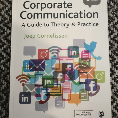 Joep Cornelissen Corporate Communication: A Guide to Theory & Practice -oppikirja, aiheena yritysviestintä liiketoiminnan ja taloustieteen näkökulmasta. Kirja käsittelee organisaatioiden viestintää, viestintästrategioita, sidosryhmäviestintää sekä viestinnän roolia yrityksen maineen ja brändin hallinnassa. 5. Painos. Muutama korostustussin hightlight oppimista tukemaan löytyy valmiina.