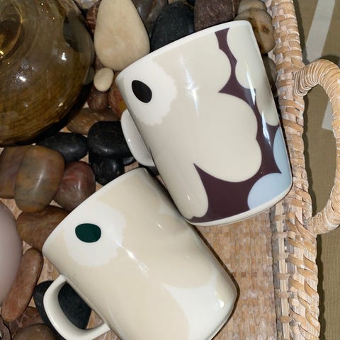 Marimekko Unikko mukit 2,5 dl, värit: vihreä, valkoinen, oranssi, harmaa. Käyttämättömät mukit (2 kpl), tarrat kiinni. Yhden mukin hinta 22 e. Toimitus: nouto tai lähetys
