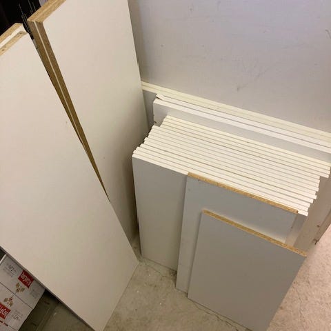 Sisältää neljä kokonaista osb-levyä 1x120x260cm, tukipuut, villat ja jalkalistoja. Samalla vietävä pois myös ylijäämä levyt. Kunto on muuten hyvä, mutta levyissä on tapettijämiä. Sisäpuolet tietysti täysin puhtaat.