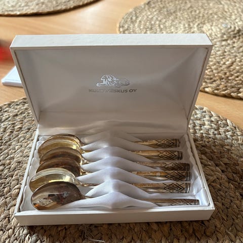 Myydään täysin käyttämätön ja virheetön 6 kappaleen sarja Simpukka-ruokalusikoita alkuperäisessä rasiassaan.