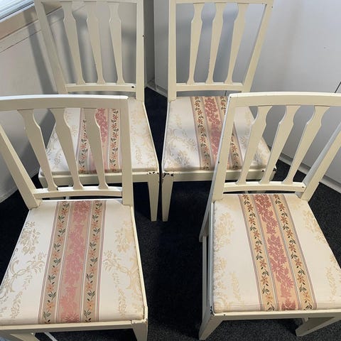 Vanhat talonpoikaistyyliset puutuolit. Kolmessa tuolissa vaihteleva määrä nitkumista jalkojen ja istuinosan välillä, mutta tämä varmasti korjattavissa.
