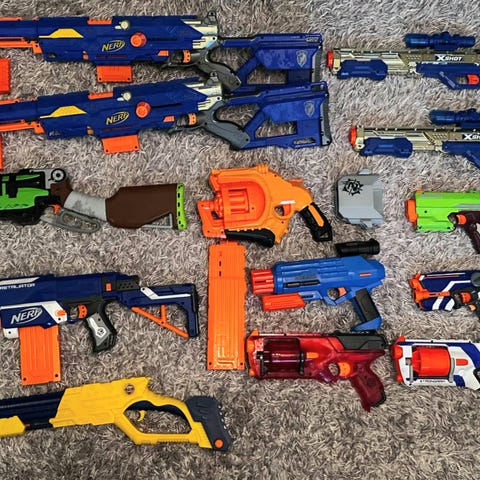 Nerf leluasepaketti, jossa useita erikokoisia ja -mallisia vaahtonuolet ampuvia leluaseita. Pakettiin kuuluu mm. pitkiä kiväärimallisia ja lyhyempiä pistoolimallisia leluaseita eri väreissä, kuten oranssi, sininen, keltainen ja vihreä. Tuotteet on tarkoitettu lasten leikkikäyttöön pehmeiden vaahtonuolet ampuvien lelujen kanssa sisällä tai ulkona. Sopii esimerkiksi yhteisiin leikkeihin ja roolileikkeihin useamman lapsen kanssa. Huomioitava valmistajan ikäsuositus ja turvaohjeet (esim. silmäsuojaus ja ampumisen välttäminen kohti kasvoja).