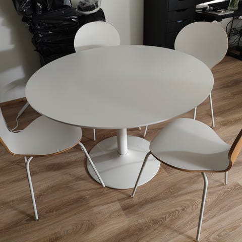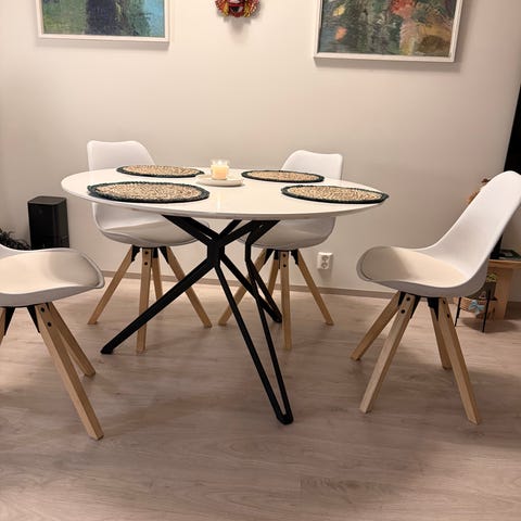 Myydään musta pyöreä ruokapöytä ja neljä tuolia. Pöytälevyn halkaisija on 110 cm. Korkeus 75 cm. Erittäin hyvässä kunnossa, ei juurikaan käytön jälkiä. Nouto Leinelästä.
