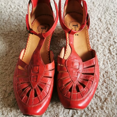 Kauniin punaiset, nahkaiset Think-merkkiset kengät.