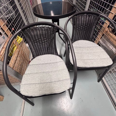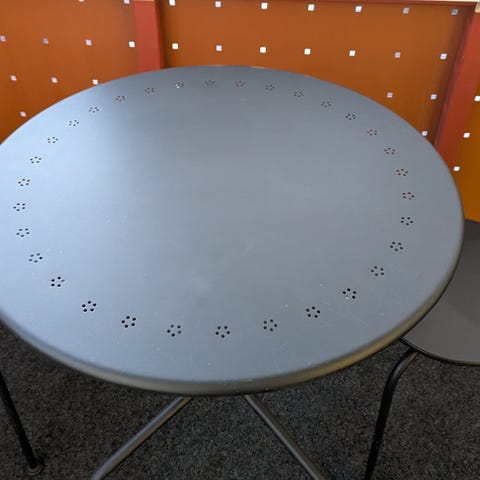Rungot ovat mustaksi maalattua metallia ja istuin- sekä pöytätasot vaaleanruskeaksi petsattua puuta. Sekä pöytä että tuolit ovat kokoontaitettavia, mikä helpottaa säilytystä.