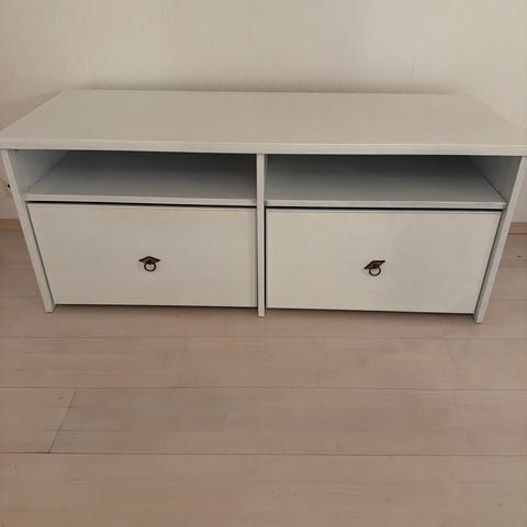 Matala valkoinen hyllykkö leveys 92, korkeus 43, syvyys 34.