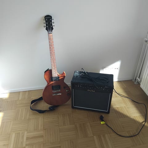 Myydään kitara hyvässä kunnossa. Kaikki toimii kuten pitää. Alhaalla sisäpuolella on pieni lohkeama, kuten kuvassa näkyy.