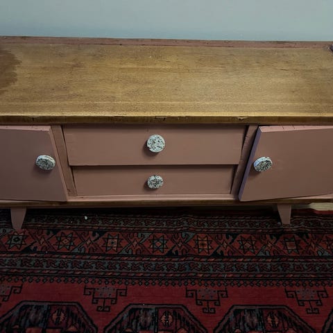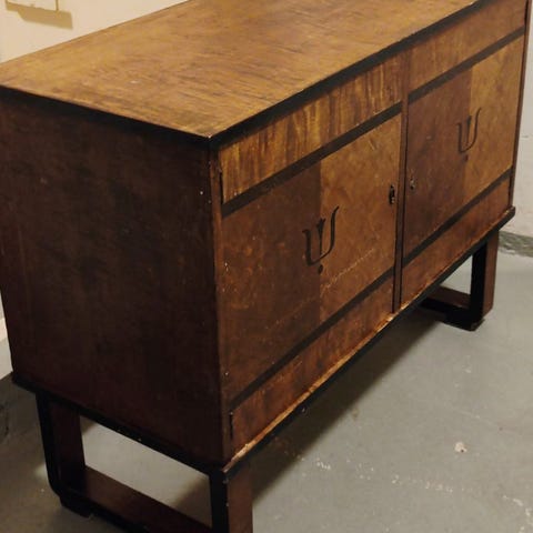 Erittäin kaunista designia, käsityönä tehty, todennäköisesti uniikki senkki. Kaksi aukeavaa ovea sekä yksi vetolaatikko. Luultavasti 70-luvulta. Pinnoissa käytön jälkeä. Edelleen täysin tukeva.