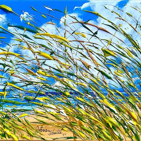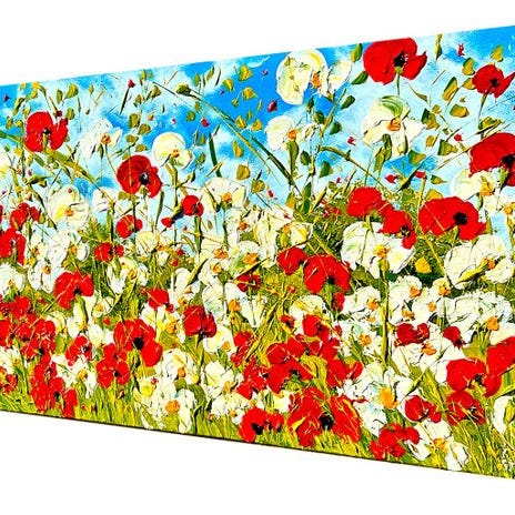 "Ylväs kukkien loisto punaisen unikon ja sinisten kukkien kanssa" miten mitat 40x50 cmYlpeä kukkien loisto punaisen unikon ja sinisten kukkien kanssa loistaa tämän kankaan kuvanaiheena.Etualalla kirkkaat ruohosäieet lepäävät rentoutuneesti kuvan yllä, mikä antaa värille keveyttä ja vähän leikillisyyttä.Väri on erittäin intensiivisesti maalattu. Maalaan periaatteessa vain erittäin laadukkailla väreillä, joiden värien loisto säilyy vuosia niin, kuin näette tämän kankaan ostettaessa.Kuva täynnä ystävällisyyttä, upea tilavaikutelma, raikkaan virkistävä ja samalla lämmin.Etupuolella ja takakannessa signeerattu.Sivureunat on maalattu kuin kuvan motiivi ja jatkuvat värityksen mukaan.Keilrahmakiinnitteinen / Keilrahmentievyys 2 cm, suoraan ripustettavaksi.PATRIZIA SCHÜLLER / www.schueller-artdesign.deSyntynyt 1975 Ratibor/Oberschlesien2002 - 2003 Maalaus & grafiikka taidekoulutuksessa ja taideterapiankoulutuksessa, BochumUseita vuosia abstraktin maalaamisen sekä maisema- ja asetelma-maalaamisen opintojaSeitsemän 2002 itsenäinen taiteilijaAsuu ja työskentelee Leverkusenissa.