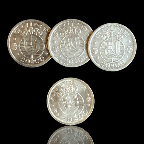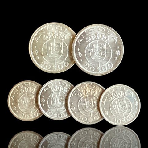 Angola Portuguesa, Macau.lote 4 moedas prata (40,05 g): Angola 10 escudos(2) + 5 Escudos + Macau 5 Patacas 1952–1955 10 Escudos1952–1955Moedas › Moedas circulantes comunsPrata 720‰ • 5 g • ⌀ 24 mmKM# 73, Schön# 18, N# 6538