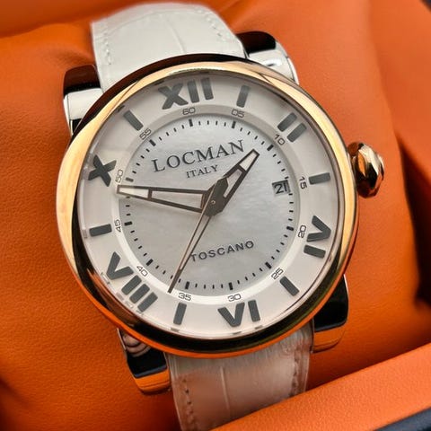 Merkki: LocmanMalli: Tutto TondoLiike: Sveitsissä valmistettu quartzKotelon koko: 40 mm, ilman kruunuaRannekkeen pituus: 20 cm yhteensäKellotaulu: äidinhelmiKunto: UusiTakuu: LOCMANin virallinen takuuSisältö: Täysi setti