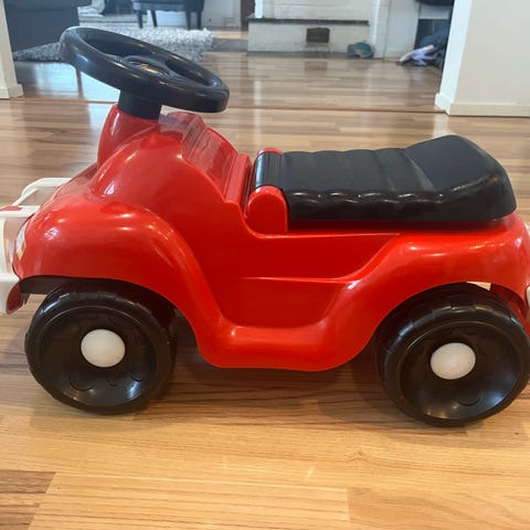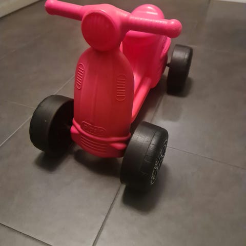 Plasto potkuauto lapsille. Nelipyöräinen malli, jossa on istuin ja ohjattava etuosa. Valmistettu muovista, väriltään musta. Sopii pienten lasten leikkeihin ja tasapainon harjoitteluun sisällä tai ulkona valmistajan ohjeiden mukaan. Pyörän renkaissa kumipehmennykset. Ollut meillä vain sisäkäytössä.