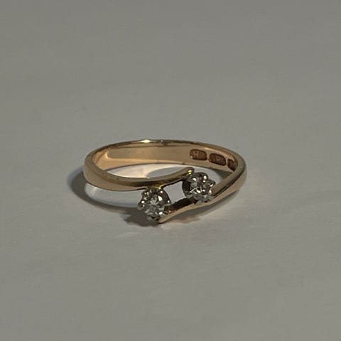 Todella kaunis 14k sormus, jossa 5 timanttia. Leveimmän kohdan leveys 6mm. Puhdistettu ultraäänipesurissa eli valmis käyttöön. Koko 17.25. Ei kaiverruksia.