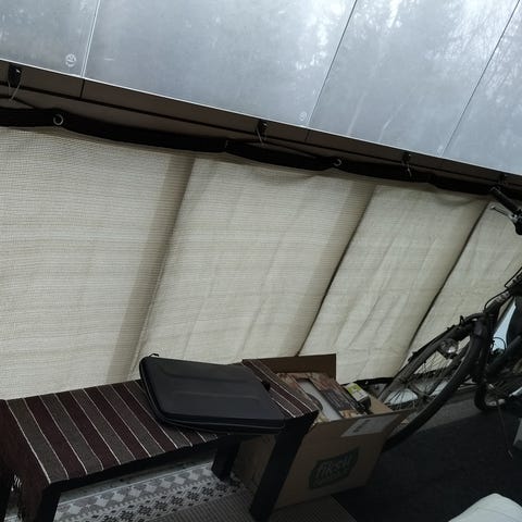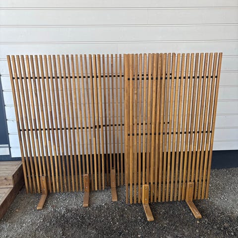 Kolme puista näkösuojaa/sermiä. Sermeissä taipumista ja halkeilua. Yhdessä sermissä katkennut rima.