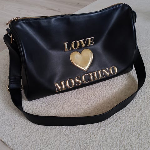 Moschino olkalaukku naisille. Materiaalina tikattu tekonahka, värinä tummansininen. Laukussa on läppä ja magneettikiinnitys, edessä metallinen Moschino-logo. Sisäpuoli on punainen ja siellä on vetoketjutasku pientavaroille. Laukussa on säädettävä olkahihna kullanvärisin metalliosin. Sopii käytettäväksi pienenä arki- tai iltalaukkuna, johon mahtuu esimerkiksi puhelin, lompakko ja avaimet.