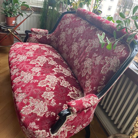 Vintage-sohva ja nojatuolit punaisella kukkakuosisella verhoilulla