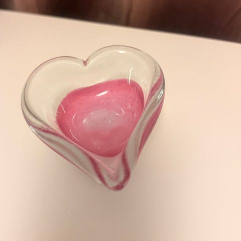 Punainen lasinen sydänrasia, jossa irrotettava kansi. Sopii pienten esineiden, korujen tai makeisten säilytykseen ja kattauksen tai sisustuksen yksityiskohdaksi. Materiaali on värillistä lasia, muoto sydän. Myydään kuvien mukaisena settinä.