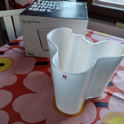 Uuteen kotiin, koristeena ollut (ei maljakko käytössä) musta Aalto maljakko.