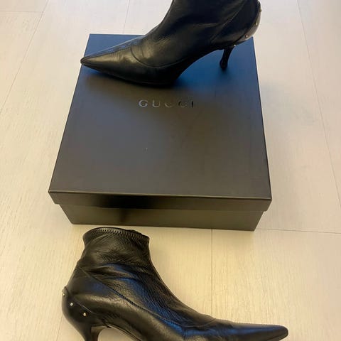 Gucci loafersit, koko 38. Väriltään mustat. Päällinen sileää nahkaa, edessä metallinen koriste. Matala kanta ja umpinainen malli. Sopivat arki- ja juhlakäyttöön. Kengät kuuluvat loafersit ja purjehduskengät -tyyppisiin kenkiin.