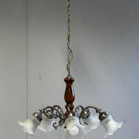 AT-valaisin riippuvalaisin Kattokruunu, jossa on kuusi valopistettä valkoisilla lasikuvuilla ja koristeelliset metalliosat. Tyyli on klassinen, ja se sopii hyvin perinteiseen sisustukseen. Valaisimessa on koristeellisia yksityiskohtia, jotka lisäävät sen viehättävyyttä.