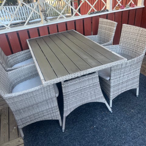 Polyrottinkinen setti, johon kuuluu 2 x korkea nojatuoli, rahi ja 1 x pöytä (koko 51x51, korkeus 42cm.). Nojatuolissa ja rahissa on harmaat istuin- ja selkätyynyt. Runko on punottua polyrottinkia, väri harmaan sävyinen. Sivupöydässä on lasikansi ja alataso säilytystä varten. Sopii parvekkeelle tai terassille istuinryhmäksi.
