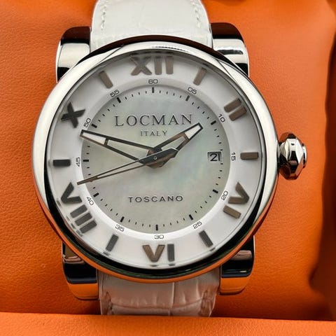 Merkki: LocmanMalli: Toscano AutomaticoLiike: AutomaattinenKotelo: 42 mm ilman kruunuaRannekkeen pituus: 22 cm yhteensäSolki: LogattuKellotaulu: HelmiäisTakakansi: Näkyvä/läpinäkyväKunto: UusiTakuu: Virallinen Locman-takuuVarusteet: Täysi setti