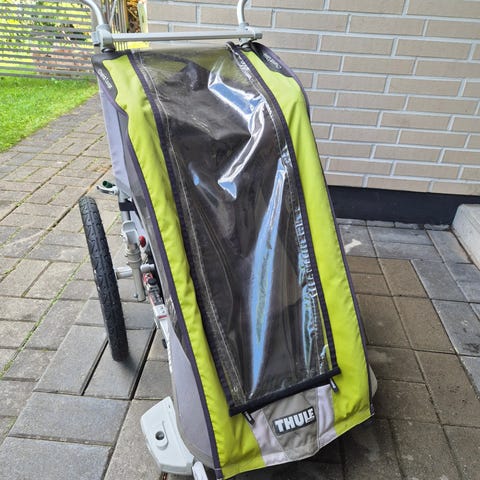 Thule Cheetah Chariot yhden lapsen erittäin kevyt pyörä-/juoksukärry, toimii myös kävelyrattaina. Kärryssä on säädettävä työntöaisa, aurinkolippa, hyttysverkko, sadesuoja, pehmustettu istuinosa sekä takana iso verkkotasku. Kantavuus 34kg. Säilytetty sisätiloissa. Mukaan saa halutessaan myös pyöräkärryyn tarkoitetun makuupussin.