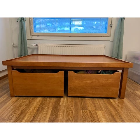 Hyväkuntoinen leikki pöytä missä on lego alusta. Irrotettava laatikko. Korkeus 36cm, leveys 67, syvyys 40cm.