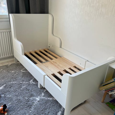 Puinen yhden hengen sänky vaaleaa puunsävyä. Sängyn leveys 80 cm, korkeus 66 cm ja pituus 195 cm. Patjan leveys 75 cm ja pituus 190 cm.
