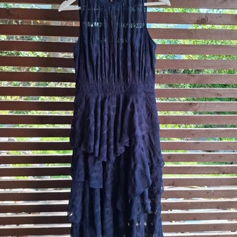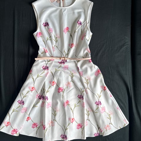 Ted Baker juhlamekko, koko 4/L. Valkoinen mekko. Kankaassa on monivärinen kukka- ja lehtikuviointi.