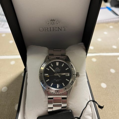Todella siisti Orient-diver safiirilasilla ja alkuperäisen rannekkeen kaikkine paloineen lisäksi kumiranneke mukaan mikä sopii minusta kellolle paremmin. Oma ranne 17cm jos haluaa kellon koosta osviittaa. Toimii moitteetta ja edistää noin +4s päivässä mikä on varsin hyvä kyseiselle koneistolle. Alkuperäinen paketti ilman ulkopahveja mukaan.