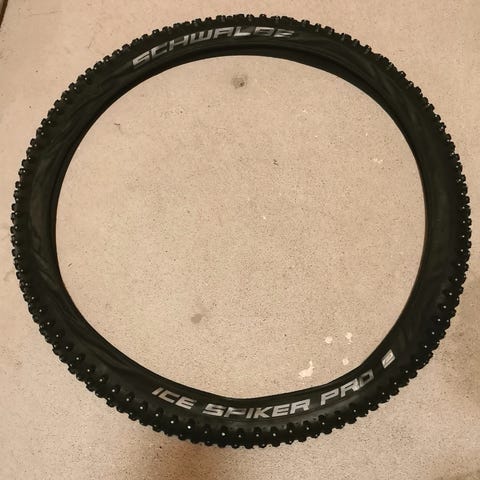 Schwalbe Ice Spiker Pro polkupyörän nastarengas. Maastopyörään suunniteltu talvirengas, jossa on runsaasti teräsnastoja parantamaan pitoa jäällä ja lumella. Sivussa merkinnät Ice Spiker Pro ja TLE. Soveltuu maastopyöräilyyn talviolosuhteissa. Väriltään musta kumirunko heijastavilla Schwalbe-logoilla.