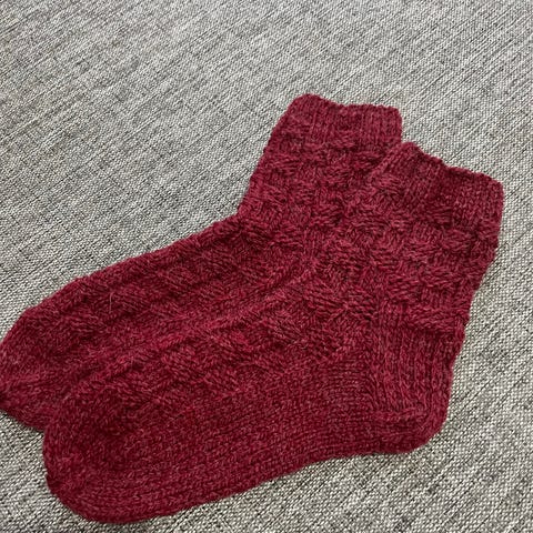 Käsinneulotut villasukat. Sukissa on monivärinen kuvio, jossa harmaan, punaisen ja beigen sävyjä. Varressa on joustinneule ja jalkaterä sileää neuletta. Sopivat käytettäväksi arjessa tai kotisukkina viileään vuodenaikaan. Pituus näkyy kuvassa mitan avulla.
