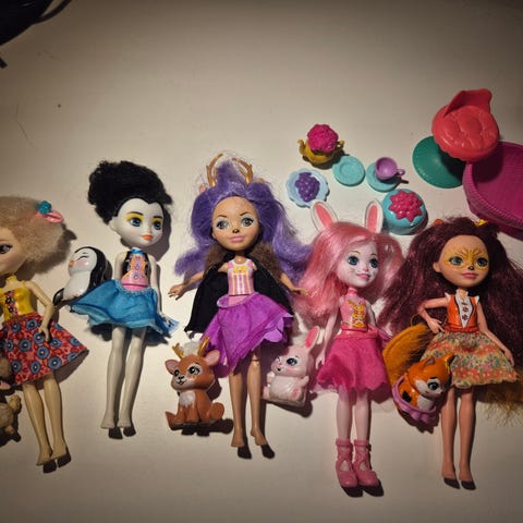 Myydään lelusarja. Pehmoleluja, nukkeja sekä pussi pieniä leluja.