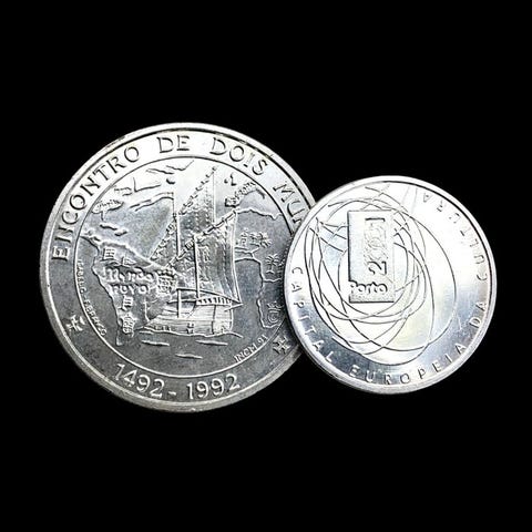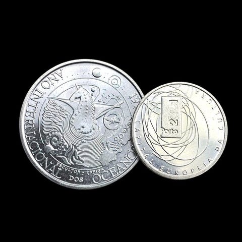 Maailman kolikotPortugal2 hopeakolikoita: 1× 1000 Escudos (Combatants-liiga) + 1× 500 Escudos (Euroopan kulttuuripääkaupunki) - 41 g 1000 Escudos (Liga dos Combatentes)ND (1998)Kolikot › Käyttöiset muistomitalikolikat: Järjestelmä 1981-2001 – 75-vuotisjuhla - Combatants-liigaHopea (.500) • 28,2 g • Ø 40 mmKM# 714, Gomes# R 166, N# 22012 500 Escudos (European Culture Capital)ND (2001)Kolikot › Käyttöiset muistomitalikolikat: Järjestelmä 1981-2001 – European Capital of CultureHopea (.500) • 13,96 g • Ø 30,1 mmKM# 733, Gomes# R 150.01, N# 13046---------------Toimitustiedot:Kohteitamme ei voida toimittaa yhdellä toimituksellaAina vakuutettuEi noudettavissa myymälästä