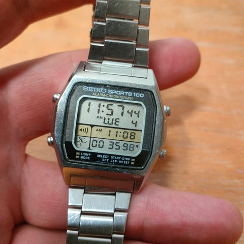 Myydään miesten täysin toimiva ja taulultaan aivan siisti mutta lasistaan hyvin naarmuinen seiko Chronograph Sports 100 Quartz.Kellon halkaisija ilman nuppeja on n.39 m ja ranneke riittää n.22 cm. ranteeseen,harvinaisempi vanha Seiko talteen.Hinta sisältää toimituskulut pakettina,myös nouto Loimaalta.