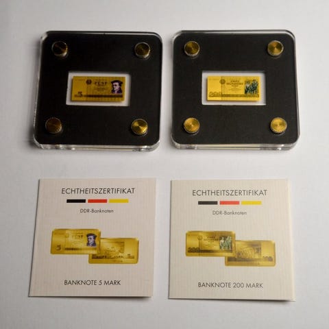 Saksa. Medal (.999 Gold) - 2 x Banknotes 0,50 & 10 Deutsche Mark 1/500oz "modern