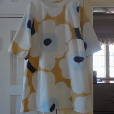 suora leikkaus ja Unikko-kuosi. Mekko on