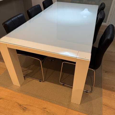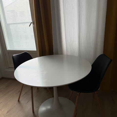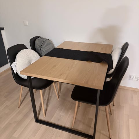 Ruokapöytä on erittäin hyvässä kunnossa ja sileäpintainen. 4 JYSK Mustard -tuolia ovat erittäin hyvässä kunnossa, puhtaat ja lähes uudet. Ei tahroja, ei heilumista, ei ongelmia. Erittäin vahva ja tukeva. Pieniä käytön jälkiä on, mikä on normaaleja.