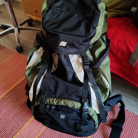 Hyvin palvellut, liian pieneksi jäänyt Halti manaus 60 litran rinkka. Vetoketjut ja lukot ehjät. Sadesuoja ehjäRinkassa paljon taskuja; sivutaskut, etutasku. Päällä tasku ja myös sen sisäpuolella tasku. Ainoa huomautus koskee metsässä likaantunutta pohjaa, jota voisin kokeilla puhdistaa. Koiratalous.