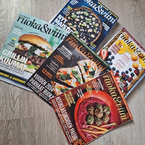Glorian Ruoka & Viini -lehdet numerosta 2/2000-2/2026. Ainoastaan ensimmäinen numero lehden julkaisemisesta lähtien puuttuu - lähes koko kollaasi siis kasassa.