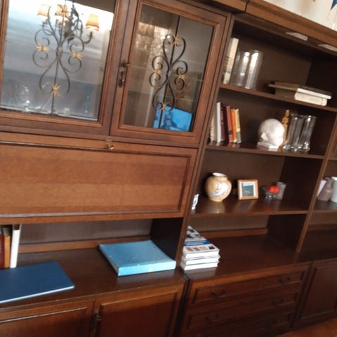 Puinen vihertävänharmaaksi maalattu kirjahylly, jossa on neljä irrotettavaa hyllytasoa. Hyllyjen korkeutta voi säätää muutamien valmiiden reikien avulla. Maalaus on tehty pehmeällä lakkamaalilla, johon on tullut kirjoista jälkiä. Taustalevy on laudoitettu ja maalattu.