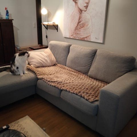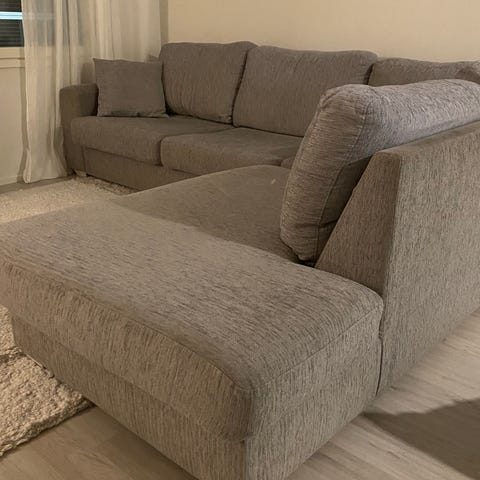Vanha, suoraa käytöstä, tyynyt pitäneet hyvin muotonsa. Hyvä istua ja nukkua ☺️
