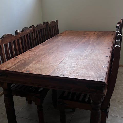 Viehättävä ja keveä retroruokailuryhmä 1970-luvulta. Siisti pöytä on jatkettava kolmella erilevyisellä jatkopalalla: 24 cm, 33 cm ja 57 cm. Tuolien istuinkorkeus 45 cm ja niissä vaalea verhoilu. Kalusto on huolella pidetty, vaikka vuosien saatossa on tullut käytön jälkiä.