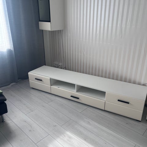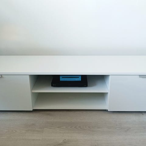 Korkeakiiltoinen valkoinen tv-taso täysipuuta. Myydään uuden tason alta pois. Nopein hakija saa matkaansa. Maksu käteisellä tai mobilepayllä