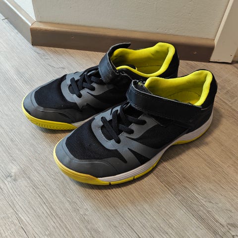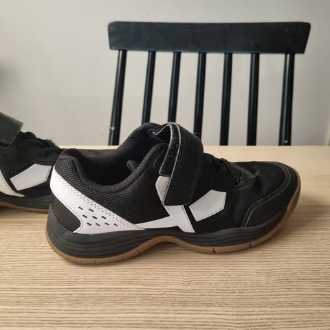 SOC lasten sisäpelikengät, koko 34. Väriltään mustat valkoisilla yksityiskohdilla ja ruskealla pohjalla. Kengissä on nauhat ja tarrakiinnitys, jotka tukevat jalkaa ja helpottavat pukemista. Päällinen on tekstiiliä ja synteettistä materiaalia, pohja kuvioitu paremman pidon takaamiseksi.