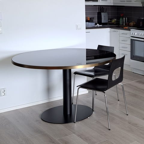 Metallituolit ja lasikantinen pöytä. Lasi ehjä ja naarmuton, tuolien ja pöytien kromi siisti ja ruosteeton. Koko setti erinomaisessa kunnossa.