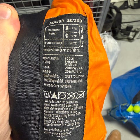 Pitkä vetoketju (oikealla sivulla) aukeaa molemmista päistä, hupussa kiristysnauha. Jalkopäässä ripustuslenkit tuulettamista helpottamaan. Kuljetuspussi.