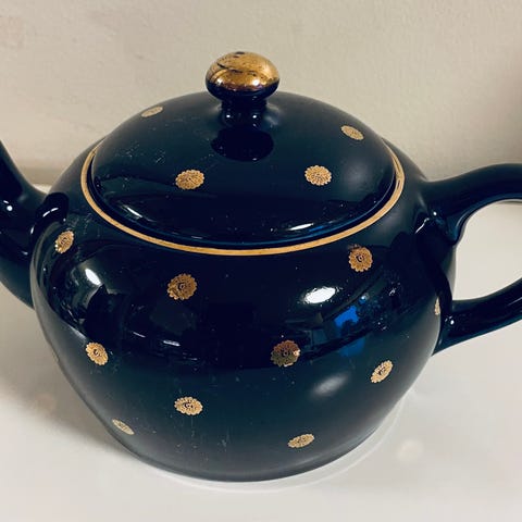 Arabian astioita kullanvärisellä reunakoristelulla. Kuvissa näkyy teekannu, kastikekulho aluslautasella, tarjoiluastia kannella sekä lautanen.