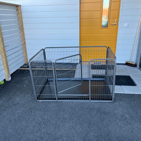 Soveltuu esimerkiksi pennun tai pienen koiran rajatuksi leikki- ja lepoalueeksi. Helposti koottava 8 paneelin aitaus. Paneelit liitetään toisiinsa tukevasti koko paneelin korkuisilla pinnoilla, mikä tekee rakenteesta tukevamman.